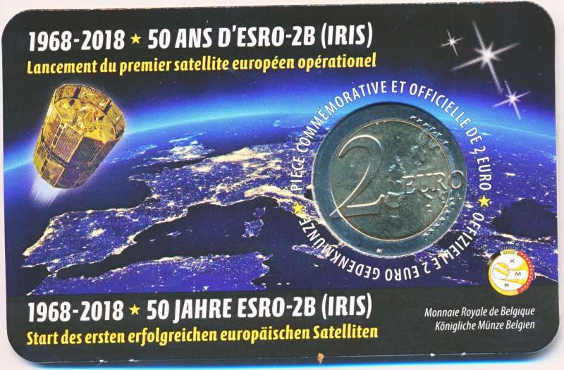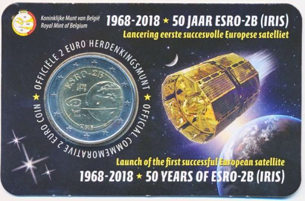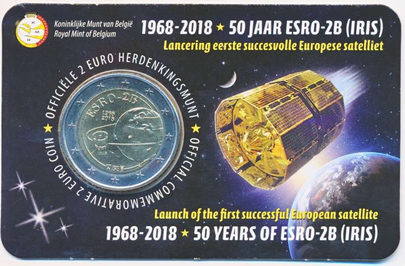 Uitgifte van de speciale 2 euromunt in het teken van de lancering van de eerste succesvolle Europese satelliet.