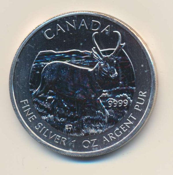 De 2013 Canadian Pronghorn Antelope Silver Bullion Coin, de eerste uitgave uit 2013 werd voor het eerst aangekondigd door de Royal Canadian Mint op de ANA’s World’s Fair of Money in Philadelphia, gehouden van 7-11 augustus 2012. Het omgekeerde ontwerp toont de Pronghorn-antilope in een grasveld.