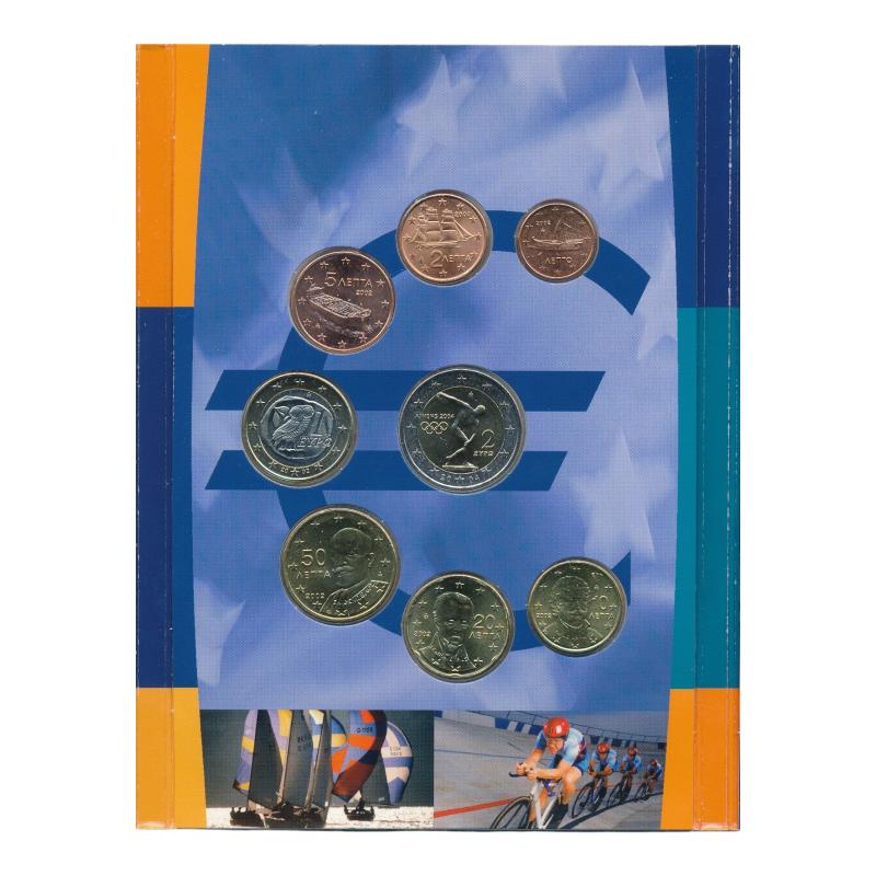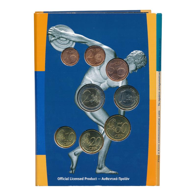 Griekenland Euromuntenset 2002 BU met 2 Euro herdenkingsmunt – Olympische Spelen Athene تحتوي المجموعة على سنت واحد يورو إلى 2 يورو بجودة BU.