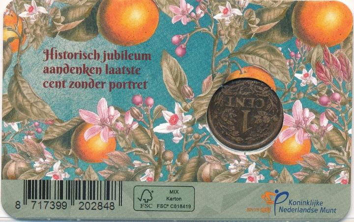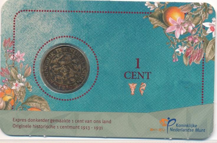 De eerste 1 cent munt van Nederland werd in 1817 onder Koning Willem I geslagen. De laatste bronzen 1 centmunt zonder portret verliet ’s Rijksmunt in 1941, nu alweer ruim 80 jaar geleden. De centen van Wilhelmina ondergingen tussen 1892 en 1941 een aantal subtiele ontwerpwijzigingen. Met name werd de leesbaarheid verbeterd en kregen de oranjetakken een prominentere rol. Tussen 1913-1931 maakte men de muntplaatjes voor de cent expres donkerder, om verwarring met het nieuwe (en enige!) gouden Vijfje van Wilhelmina met nagenoeg dezelfde diameter tegen te gaan. Als eerbetoon aan deze speciale uitvoering verschijnt in 2024 een originele bronzen, donkere 1 cent munt 1920 in coincard.
