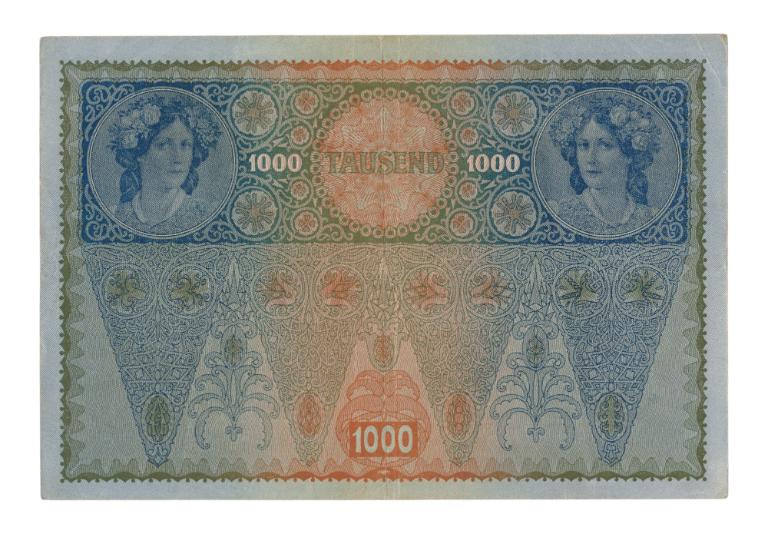 1000 Kronen was in begin 20e eeuw een groot bedrag, en de biljetten kwamen eigenlijk pas echt veelvuldig in omloop na de eerste wereldoorlog omdat er in het nu ‘Deutsch Österreich’ een hyperinflatie was ontstaan.