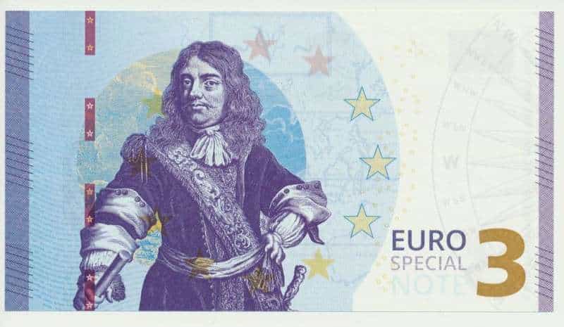 Die Rückseite des Euro-Sonderscheins zeigt Cornelis Tromp. Cornelis Tromp (1629 -1691) war der zweite Sohn von Maarten Harpertsz. Tromp, dem berühmten niederländischen Seefahrer und Admiralleutnant der niederländischen Marine. Cornelis Tromp wurde schließlich Oberbefehlshaber der dänischen und niederländischen Flotte.