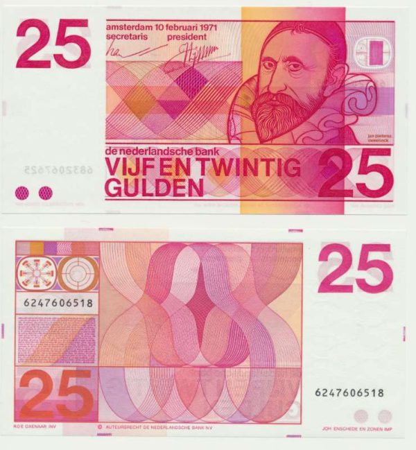 Het vijfentwintig gulden biljet is geïntroduceerd in 1971, en heeft de beeltenis van componist Jan Pieterszoon Sweelinck. Het volgde zijn voorganger met de afbeelding van Christiaan Huygens op, welke al uit de jaren 50 stamde. Het biljet van 25 gulden met Sweelinck heeft op de voor- en achterzijde kleurrijke guilloche patronen en is daarom ook erg geliefd onder bankbiljettenverzamelaars. De vijfentwintig gulden met Sweelinck is onderdeel van de erflater serie van Oxenaar, naast het geeltje zijn er ook nog de: