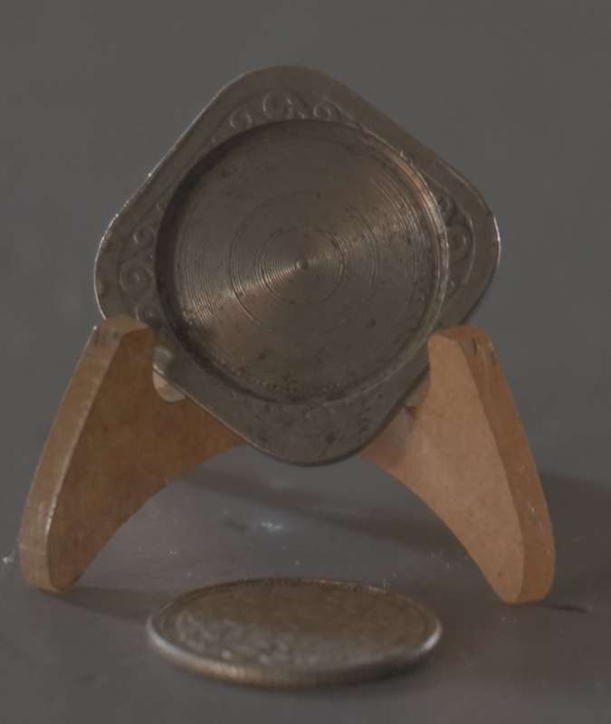 Deze vierkante stuiver van Wilhelmina heeft een bewerkte rondvormige inkeping waar de zilveren 10 cent van Wilhelmina precies in past. Dit zilveren dubbeltje is inclusief dit bijzondere item.