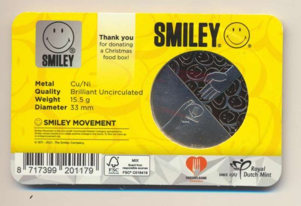 The Smiley Company, bedenkers van de originele ‘smiley’, bestaat 50 jaar! Om dit te vieren, geeft de Koninklijke Nederlandse Munt in samenwerking met de Smiley Movement en de Voedselbank Amsterdam een speciale penning in coincard uit. De gehele opbrengst van de Voedselbank Amsterdam-coincards gaat naar de Voedselbank Amsterdam, zodat zij met Kerst voedselpakketten kunnen uitdelen. Get a smiley, give a smile!