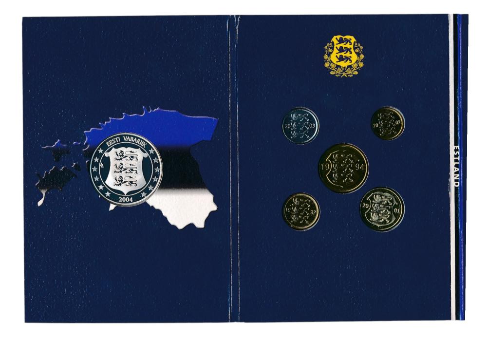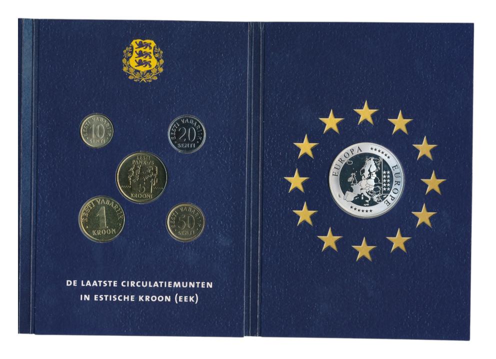 Bevat de laatste circulatie munten in Estische Kroon en een zilveren Europa-penning (geslagen in sterling zilver (925/1000). Onderdeel van de serie ‘Europa. De tien nieuwe EU-lidstaten. Gelimiteerde oplage.