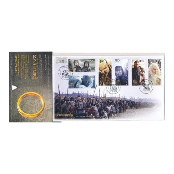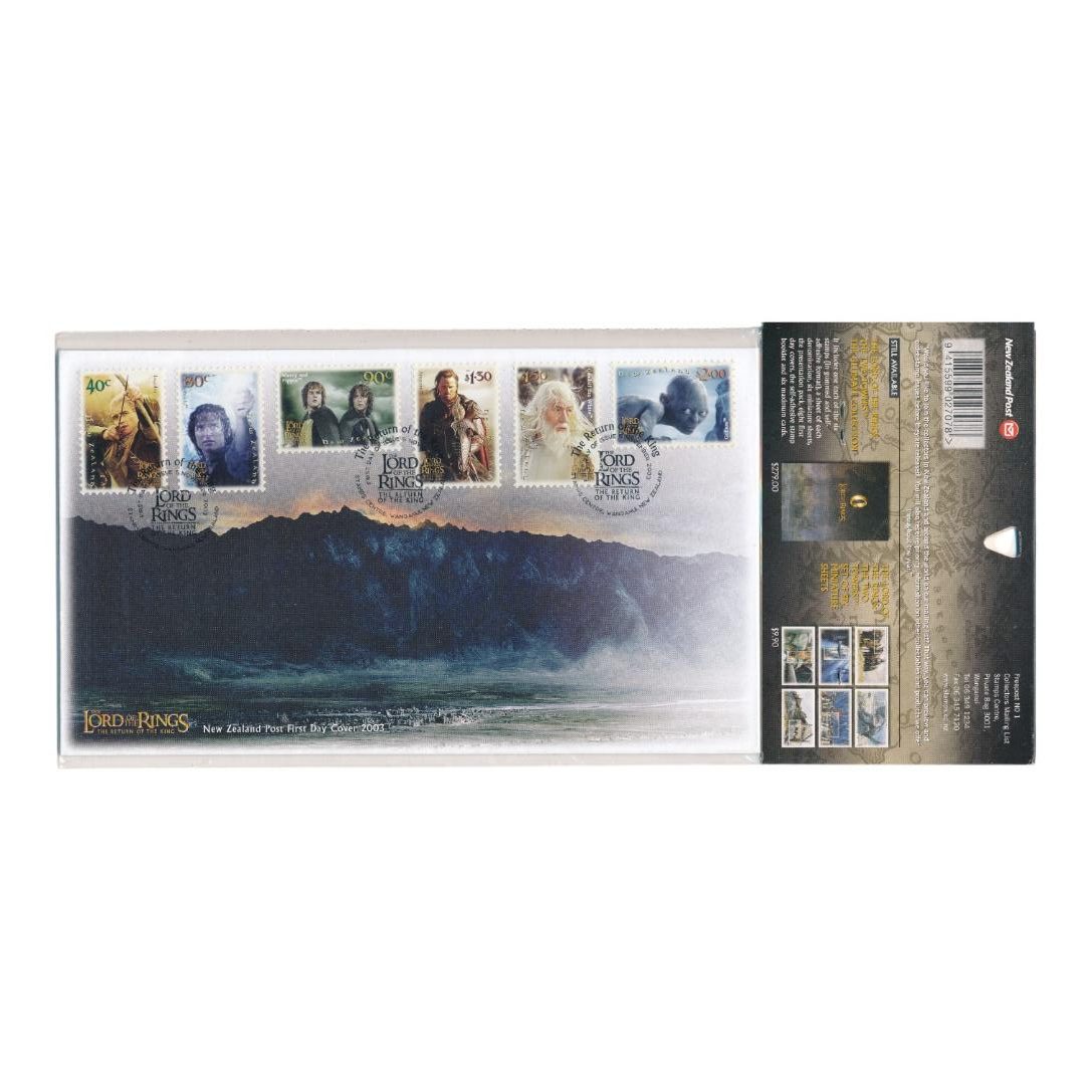 Twee gestempelde, ongeadresseerde eerste dag enveloppen, waarvan één met een complete set van zes gegomde vastgeplakte postzegels en één met een complete set van zes zelfklevende vastgeplakte postzegels. Afkomstig uit Nieuw-Zeeland. The Return of the King collectorsitem. De set heeft een lichte beschadiging in de linkerbovenhoek op het plastic bij de envelop.