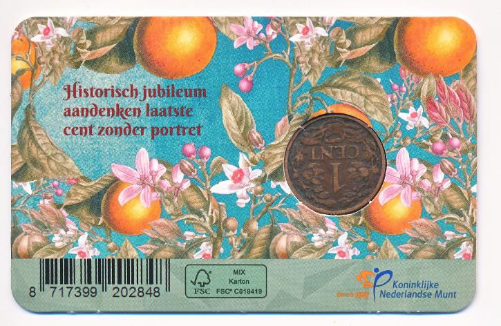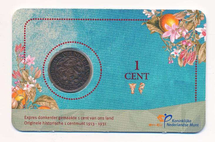 De eerste 1 cent munt van Nederland werd in 1817 onder Koning Willem I geslagen. De laatste bronzen 1 centmunt zonder portret verliet ’s Rijksmunt in 1941, nu alweer ruim 80 jaar geleden. De centen van Wilhelmina ondergingen tussen 1892 en 1941 een aantal subtiele ontwerpwijzigingen. Met name werd de leesbaarheid verbeterd en kregen de oranjetakken een prominentere rol. Tussen 1913-1931 maakte men de muntplaatjes voor de cent expres donkerder, om verwarring met het nieuwe (en enige!) gouden Vijfje van Wilhelmina met nagenoeg dezelfde diameter tegen te gaan. Als eerbetoon aan deze speciale uitvoering verschijnt in 2024 een originele bronzen, donkere 1 cent munt 1929 in coincard.