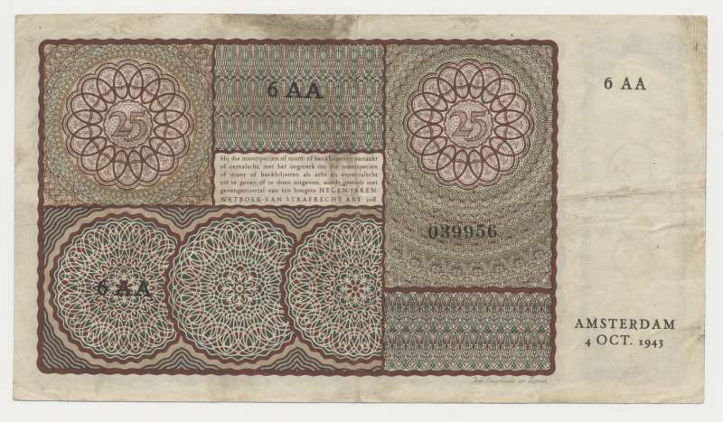 Tijdens de latere jaren van de tweede wereldoorlog was de hoeveelheid kleine bankbiljetten afgenomen. Dit kwam omdat deze én te snel sleten én omdat de zwarte markt een groot deel van het contante geld aan de roulatie onttrok. Daarom moest er meer klein-papiergeld in omloop komen, en werd het biljet ‘Prinsesje II’ in omloop gebracht. Het vijfentwintig gulden biljet van 1943 is qua ontwerp hetzelfde als de vijfentwintig gulden uit 1940, alleen is de kleur anders en is er een patroon over het lege vlak aan de linkerkant gedrukt voor meer beveiliging tegen vervalsing. Het biljet is ondertekend door DNB-President M. Rost – van Tonningen, en door DNB-Secretaris Robertson. Naast het vijfentwintig guldenbiljet zijn er ook nog de volgende biljetten bij de serie: