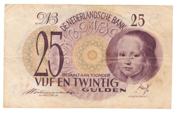 Na de oorlog was er een groot tekort aan nieuw papiergeld, en daarom werd er door de regering zo snel mogelijk een nieuwe serie ontworpen. Hier waren ook ontwerpen bij die nog van voor de oorlog kwamen, alleen was hier in de oorlog niks mee gedaan. Het vijfentwintig gulden biljet ‘meisje in het blauw’ heeft op de voorzijde de afbeelding van het schilderij met dezelfde naam van Johannes Verspronk. De handtekeningen op het biljet zijn van de DNB-President Trip, en door DNB-Secretaris Westerman-Holstijn. Het biljet is onderdeel van de uitgave van 1945 en naast het vijfentwintig gulden biljet ‘meisje in het blauw’, zijn er ook nog de volgende biljetten: