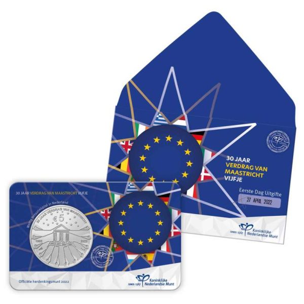 Op 7 februari 2022 was het precies dertig jaar geleden dat het Verdrag van Maastricht werd ondertekend. Het verdrag is een van de belangrijkste in de grondlegging van de Europese Unie. Ter ere van het jubileum slaat de Koninklijke Nederlandse Munt in opdracht van het ministerie van Financiën een herdenkingsmunt: het Verdrag van Maastricht Vijfje.