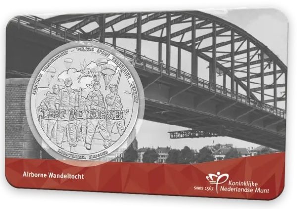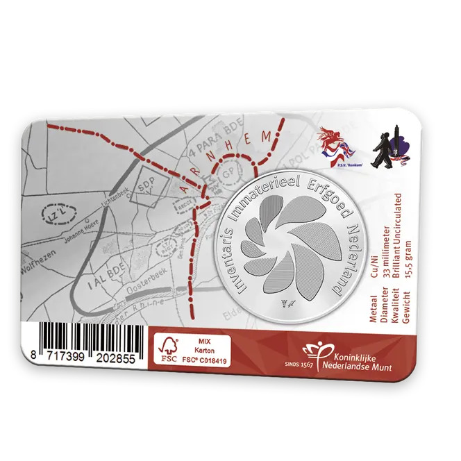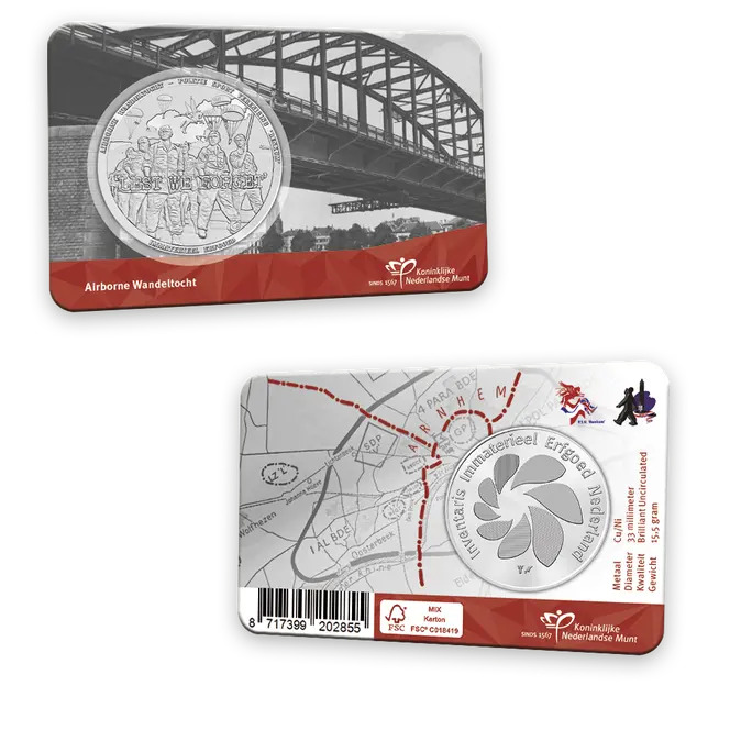 Erfgoed kent vele vormen. In 2023 en 2022 vierden we feestelijke uitgiften, met respectievelijk 10 jaar Koningsdag en het Zomercarnaval in Rotterdam. Dit jaar brengen we een speciale uitgifte uit met een belangrijke boodschap die niet vergeten mag worden. De Koninklijke Nederlandse Munt lanceert een exclusieve coincard ter gelegenheid van de Airborne Wandeltocht, om de geallieerde militairen en hun offers tijdens de Slag om Arnhem in september 1944 te herdenken. Deze Airborne Wandeltocht-penning in coincard is onderdeel van de reeks ‘Immaterieel Erfgoed in Nederland’.