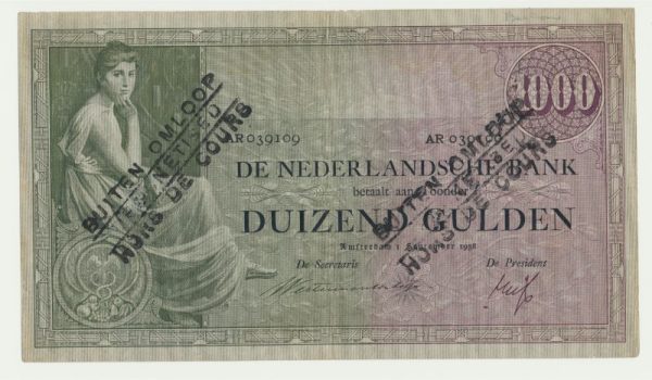 Het duizend guldenbiljet 1926/1938 is in 1942 uit omloop gehaald door DNB-President M. Rost – van Tonningen. Bij de geldzuivering in 1945 is het opnieuw opgeroepen voor inwisseling.