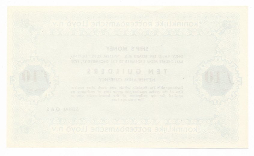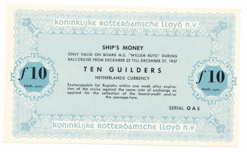 Scheepsgeld was geïntroduceerd omdat het destijds verboden was om Nederlands geld uit te voeren. Dit biljet was geldig aan boord van het schip “De Willem Ruys”. Deze waardebonnen konden tijdens de reis worden uitgegeven aan boord van het schip waarvoor ze gedrukt waren, of worden omgewisseld binnen een bepaalde termijn na aankomst op de eindbestemming. De tegoedbonnen zijn in 2 kleuren gedrukt en zijn enkelzijdig. Dit biljet is in UNC staat.