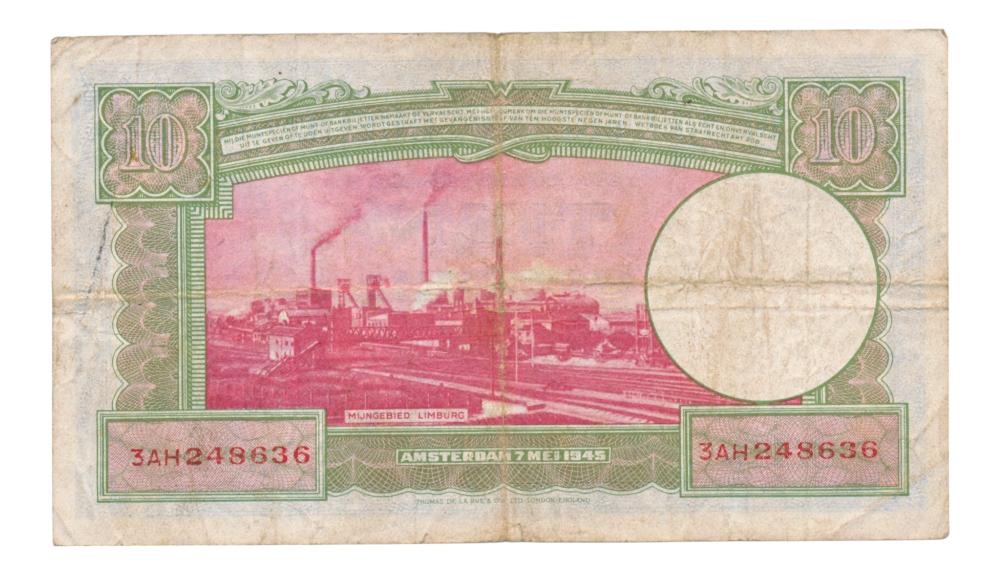 Le billet de dix florins "Staatsmijnen" comporte au recto une photo du roi Guillaume 1er et au verso une photo des mines de l'État. Le billet est encore signé par le président de la DNB, Trip, et par le secrétaire de la DNB, Westerman-Holstijn. Ce billet porte encore la mention "pays au porteur", qui a fini par disparaître des billets postérieurs à ce type. Le billet de 10 livres avec les mines de l'État fait partie de la série de billets d'après-guerre qui comprend également les billets suivants :