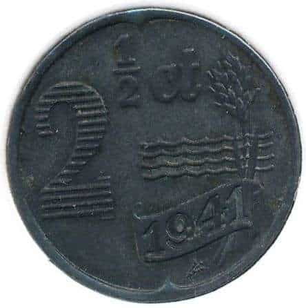 In 1941 werden alle normale munten vervangen door zinken munten, ook de twee en een halve cent. De twee en een halve cent is alleen in 1941 uitgegeven, in 1942 werden er wel twee en een halve cent munten geslagen maar die zijn op enkele tientallen na allemaal omgesmolten. De zinken twee en een halve cent heeft op de voorzijde een afbeelding van een Fries’ uilenbord, en op de andere zijde de waarde met het jaartal. Ook staat er op de muntzijde dezelfde voorstelling als op de cent, een stel golven met een hand vol graantakken. Naast de twee en een halve cent zink zijn er nog vier andere munten uitgegeven tijdens de bezetting: