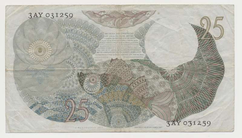 Na de serie van 1945 wilde de Nederlandsche Bank een nieuwe serie bankbiljetten laten ontwerpen die bij Johan Enschedé (Haarlem) gedrukt zou worden in plaats van Thomas de la Rue (Londen). Het biljet met de bijnaam ‘Flora’ heeft als hoofdthema natuur (planten/dieren) en heeft op de voorzijde een afbeelding van een jonge vrouw met bloemen (Flora). Op de achterkant is naast de straftekst een vis (Fauna) te zien. Het biljet is ondertekend door de nieuwe DNB-President Holtrop en door de nieuwe DNB-Secretaris de Jong. Naast het billet de vingt-cinq florins zijn er ook nog de volgende biljetten bij de serie die de Nederlandsche Bank eind jaren 40 in omloop bracht: