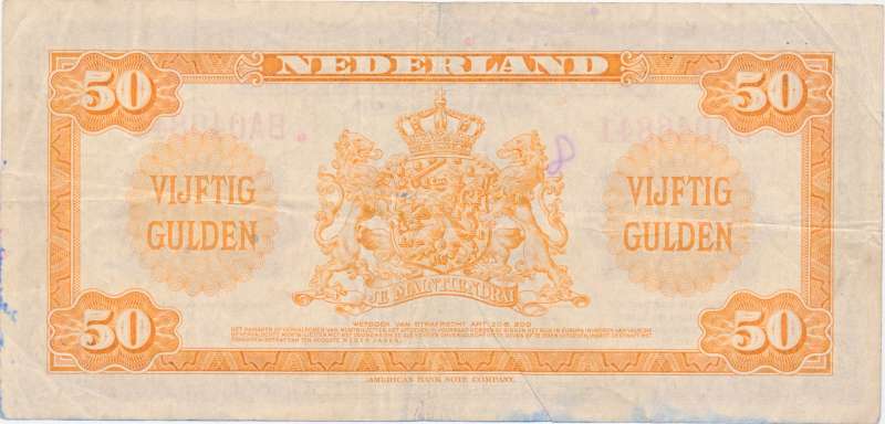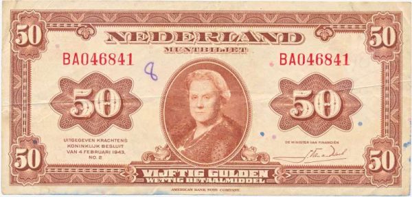 Tijdens de tweede wereldoorlog bereidden de geallieerden zich in 1943 al voor op de invasie die in 1944 plaats zouden vinden. Het muntbiljet van vijftig gulden met koningin Wilhelmina erop is dan ook onderdeel van een bijzonder stukje Nederlandse geschiedenis. Bij het bevrijden van gebieden moesten de soldaten ook geld meekrijgen om uit te kunnen geven in bevrijd gebied, omdat het lastig was buitenlands geld uit te geven in gebieden waar de koers van dat geld niet bekend was en veel inwoners het geld niet kende en waarschijnlijk ook niet aan zouden nemen. Daarom werd er door het ministerie van financiën besloten om in de Verenigde Staten Nederlandse guldens te drukken, en deze muntbiljetten hadden op de voorzijde dan ook de afbeelding van koningin Wilhelmina. Het muntbiljet van vijftig gulden is ondertekend door Johannes van den Broek (minister van financiën). Naast het vijftig gulden muntbiljet zijn er ook nog de volgende biljetten bij de in de verenigde staten gedrukte serie: