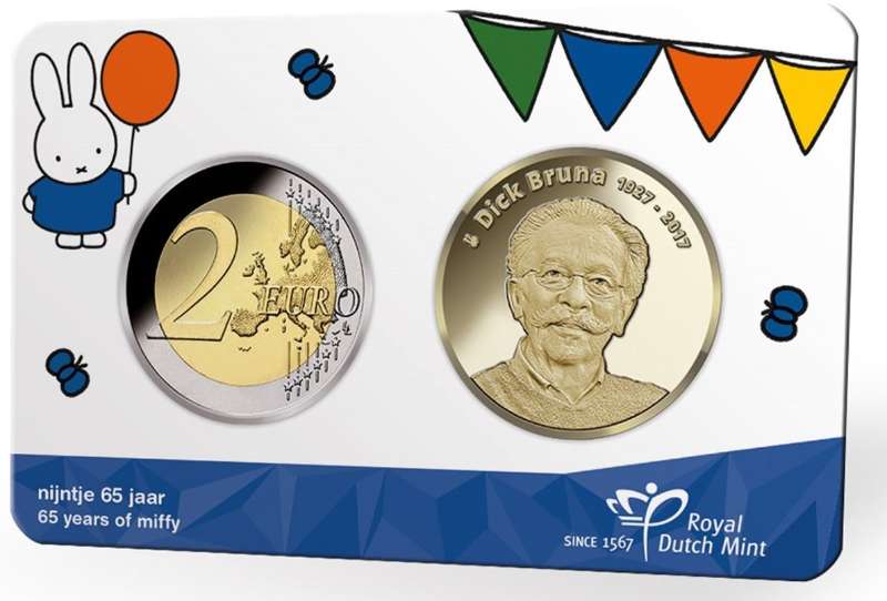 De Nederlandse coincard is pas uitgekomen met als thema “Nijntje 65 jaar”. De coincard is voorzien van een Dick Bruna penning met het opschrift: “Dick Bruna 1927-2017”. Daarnaast bevat de coincard een 2 euromunt van 2020 die niet in circulatie zal worden gebracht. Zijn 1e kinderboek schreef hij in 1955. Nu 65 jaar later komt deze uitgifte voor de verzamelaar of liefhebber beschikbaar.