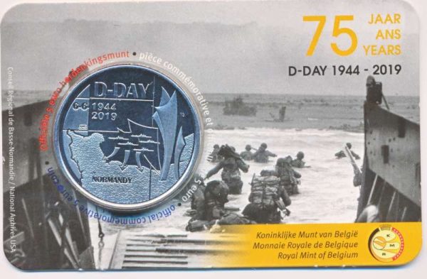 Uitgifte van de speciale 5 euromunt in het teken van 75 jaar D-day.  Als eerbetoon aan de talloze slachtoffers heeft de Koninklijke Munt van België een bijzondere 5 Euromunt uitgegeven. Op de voorkant van de munt ziet men een 5-tal amfibische voertuigen, de pijlen geven aan waar deze amfibische voertuigen geland zijn.
