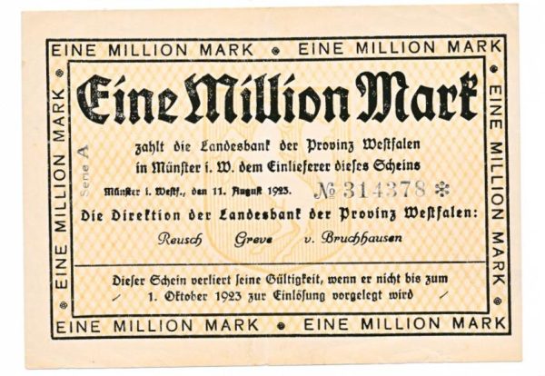 Duitsland 1 miljoen Mark 1923 bon Landesbank Westfalen (314378) Zie scans voor meer details. Voor vragen, stuur ons gerust een bericht.