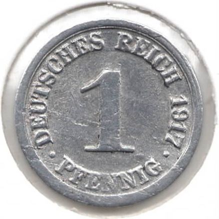 Geslagen door het Duitse rijk. Met op de voorzijde: Deutsches Reich 1 Pfennig. In tegenstelling to de andere pfennigs, is deze munt in aluminium geslagen.