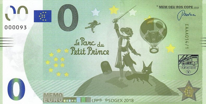 Het Parc du Petit Prince in Ungersheim ligt ten noorden van Mulhouse en op slechts een paar minuten rijden van de Duitse grens. EUROSCOPE wordt vertegenwoordigd door een medaille-donor die ook MEMOEURO-souvenirbankbiljetten uitgeeft. Motieven: De kleine prins op zijn planeet.