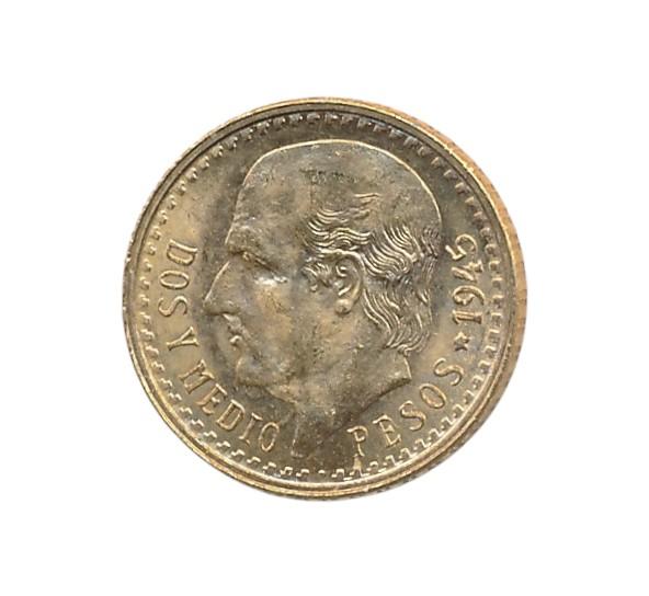De 2,5 Peso van Mexico uit 1945 bevat ruim 2 gram bruto goud en 1,87 gram netto goud. De munt heeft een diameter van 15,5 centimeter en heeft op de keerzijde de waarde aanduiding met het jaartal. Op de voorzijde staat het Mexicaanse staatswapen.