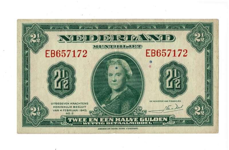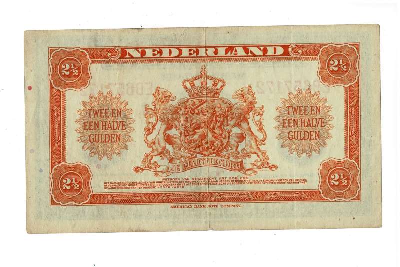 Tijdens de tweede wereldoorlog bereidden de geallieerden zich in 1943 al voor op de invasie die in 1944 plaats zouden vinden. Het muntbiljet van twee en een halve gulden met koningin Wilhelmina erop is dan ook onderdeel van een bijzonder stukje Nederlandse geschiedenis. Bij het bevrijden van gebieden moesten de soldaten ook geld meekrijgen om uit te kunnen geven in bevrijd gebied, omdat het lastig was buitenlands geld uit te geven in gebieden waar de koers van dat geld niet bekend was en veel inwoners het geld niet kende en waarschijnlijk ook niet aan zouden nemen. Daarom werd er door het ministerie van financiën besloten om in de Verenigde Staten Nederlandse guldens te drukken, en deze muntbiljetten hadden op de voorzijde dan ook de afbeelding van koningin Wilhelmina. Het muntbiljet van twee en een halve gulden is in 1943 uitgegeven en heeft de handtekening van Johannes van den Broek (minister van financiën) op de voorzijde. Bij de serie in Amerika gedrukte guldens horen ook nog de: