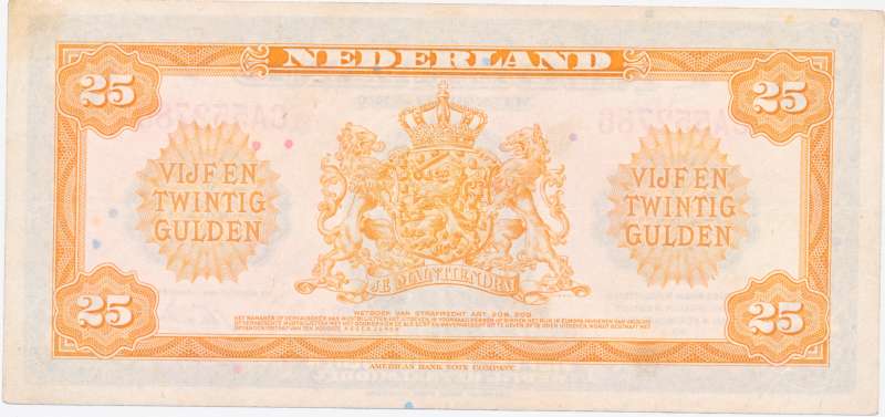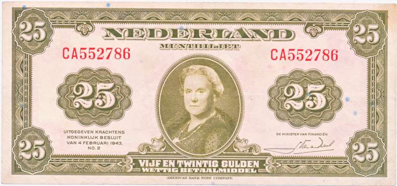 Tijdens de tweede wereldoorlog bereidden de geallieerden zich in 1943 al voor op de invasie die in 1944 plaats zouden vinden. Het muntbiljet van vijfentwintig gulden met koningin Wilhelmina erop is dan ook onderdeel van een bijzonder stukje Nederlandse geschiedenis. Bij het bevrijden van gebieden moesten de soldaten ook geld meekrijgen om uit te kunnen geven in bevrijd gebied, omdat het lastig was buitenlands geld uit te geven in gebieden waar de koers van dat geld niet bekend was en veel inwoners het geld niet kende en waarschijnlijk ook niet aan zouden nemen. Daarom werd er door het ministerie van financiën besloten om in de Verenigde Staten Nederlandse guldens te drukken, en deze muntbiljetten hadden op de voorzijde dan ook de afbeelding van koningin Wilhelmina. Het muntbiljet van vijfentwintig gulden is ondertekend door Johannes van den Broek (minister van financiën). Naast het vijfentwintig gulden muntbiljet zijn er ook nog de volgende biljetten bij de in de verenigde staten gedrukte serie: