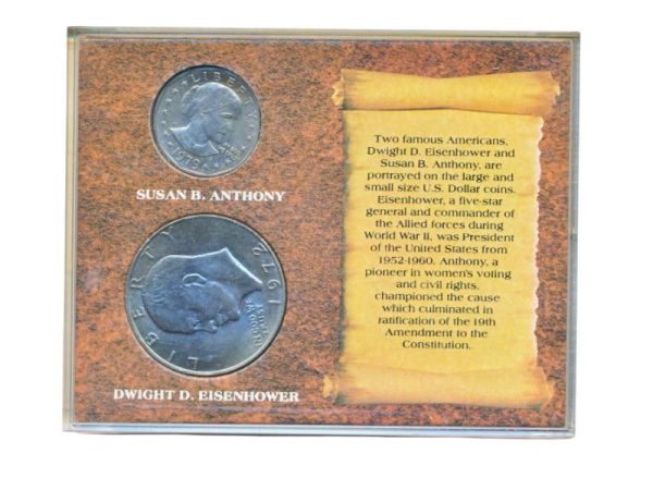 De set bevat 1 dollar 1972 (groot) en 1 dollar 1979 (klein). Op de Amerikaanse dollar-munten staan twee beroemde Amerikanen. Dwight D. Eisenhower was generaal en commandant in WOII en president van Amerika van 1952 tot 1960. Susan B. Anthony was een pionier in stem- en burgerlijke rechten voor vrouwen; ze verdedigde de zaak die leidde tot de ratificatie van het 19e Amandement op de Grondwet.