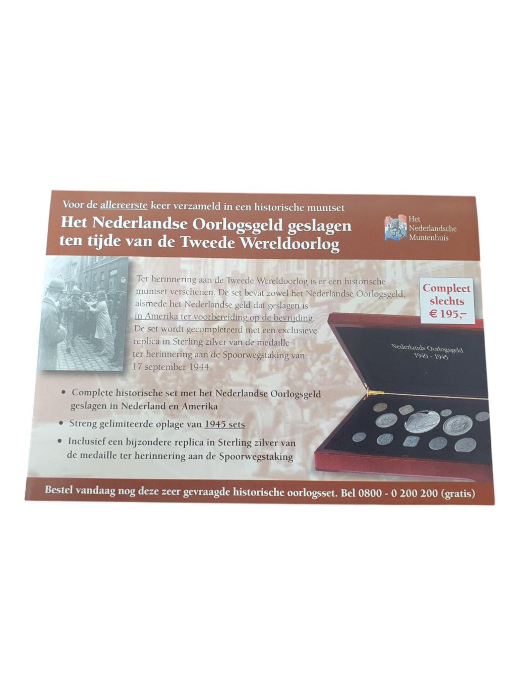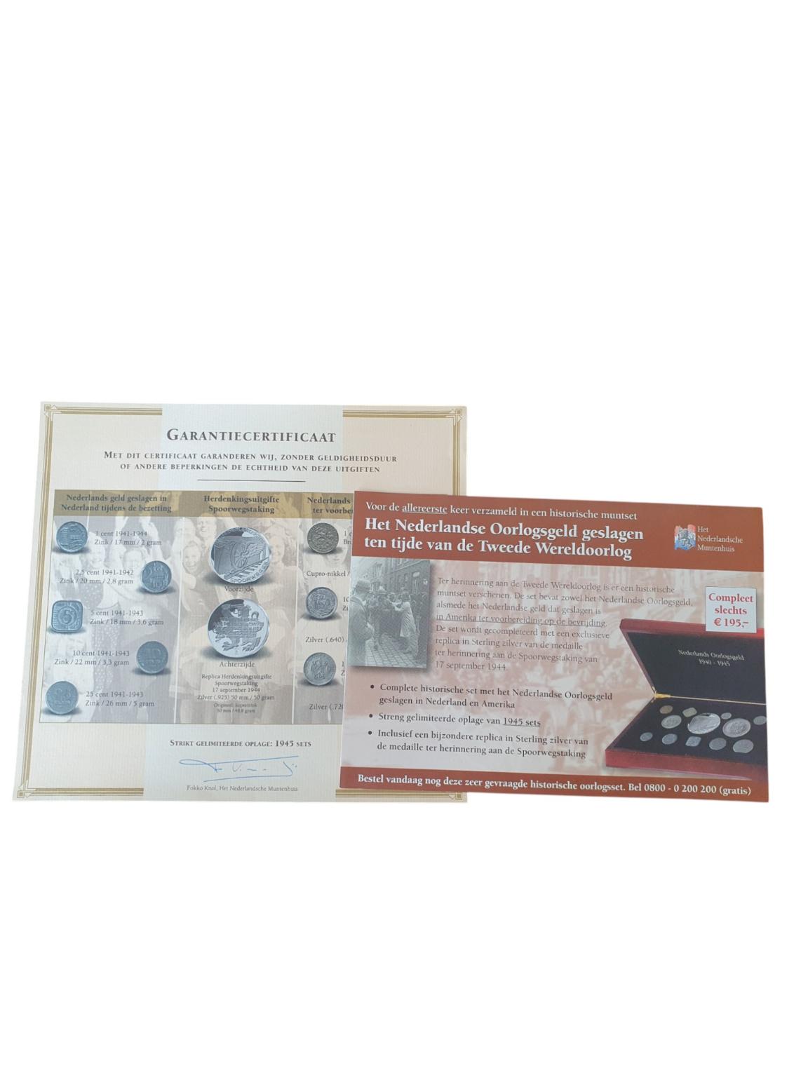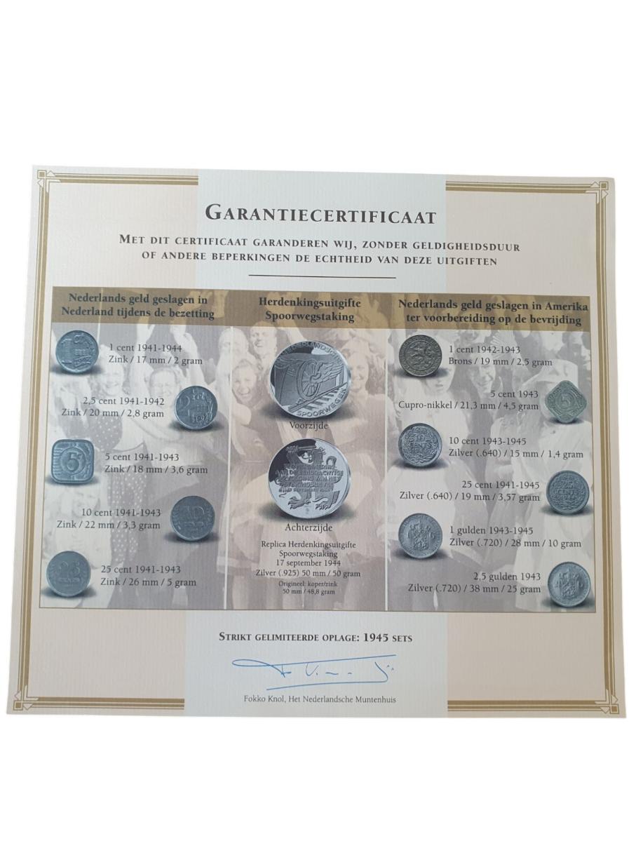 Historische muntset met het Nederlandse oorglogsgeld, en het Nederlandse geld dat geslagen is in Amerika ter voorbereiding op de bevrijding. Inclusief exclusieve replica van de medaille ter herinnering aan de Spoorwegstaking van 17 september 1944.