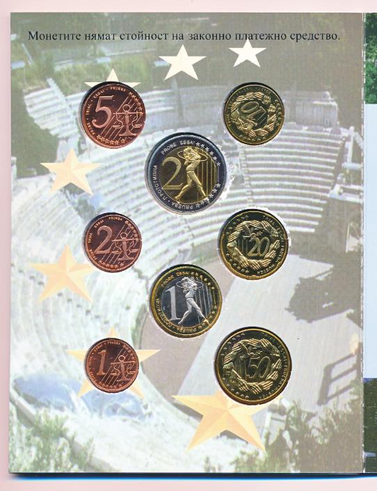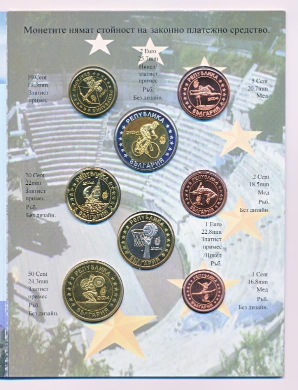 Bevat de probe 1 cent t/m de probe 2 euro met diverse sporten van de Olympische spelen. De set bevat probe/prototype euromunten en kan wat witte plakresten bevatten.