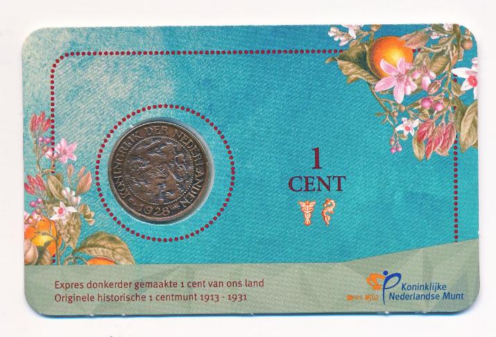 De eerste 1 cent munt van Nederland werd in 1817 onder Koning Willem I geslagen. De laatste bronzen 1 centmunt zonder portret verliet ’s Rijksmunt in 1941, nu alweer ruim 80 jaar geleden. De centen van Wilhelmina ondergingen tussen 1892 en 1941 een aantal subtiele ontwerpwijzigingen. Met name werd de leesbaarheid verbeterd en kregen de oranjetakken een prominentere rol. Tussen 1913-1931 maakte men de muntplaatjes voor de cent expres donkerder, om verwarring met het nieuwe (en enige!) gouden Vijfje van Wilhelmina met nagenoeg dezelfde diameter tegen te gaan. Als eerbetoon aan deze speciale uitvoering verschijnt in 2024 een originele bronzen, donkere 1 cent munt 1928 in coincard.