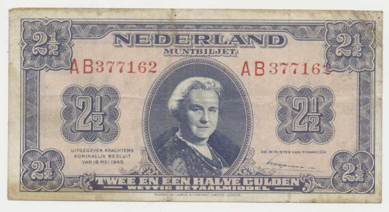Omdat er al plannen gemaakt waren om de economie na de bevrijding te herstellen doormiddel van een geldzuivering, moest er ook nieuw geld gemaakt worden om het oude geld mee om te wisselen. Daarom werden er in Londen (bij Thomas de la Rue) biljetten van een en van twee en een halve gulden gedrukt om bij de bevrijding genoeg nieuw geld te hebben. Het muntbiljet van twee en een halve gulden 1945 heeft de handtekening van de minister van financiën, Gerardus Wilhelmus Maria Huysmans, op de voorzijde. Later in 1945 zijn er ook nog biljetten van tien en honderd gulden gedrukt, en de serie bestaat in totaal uit de volgende biljetten: