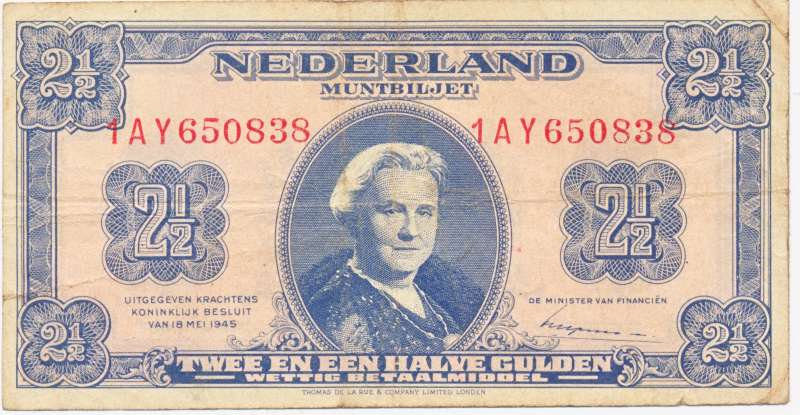 Omdat er al plannen gemaakt waren om de economie na de bevrijding te herstellen doormiddel van een geldzuivering, moest er ook nieuw geld gemaakt worden om het oude geld mee om te wisselen. Daarom werden er in Londen (bij Thomas de la Rue) biljetten van een en van twee en een halve gulden gedrukt om bij de bevrijding genoeg nieuw geld te hebben. Het muntbiljet van twee en een halve gulden 1945 heeft de handtekening van de minister van financiën, Gerardus Wilhelmus Maria Huysmans, op de voorzijde. Later in 1945 zijn er ook nog biljetten van tien en honderd gulden gedrukt, en de serie bestaat in totaal uit de volgende biljetten: