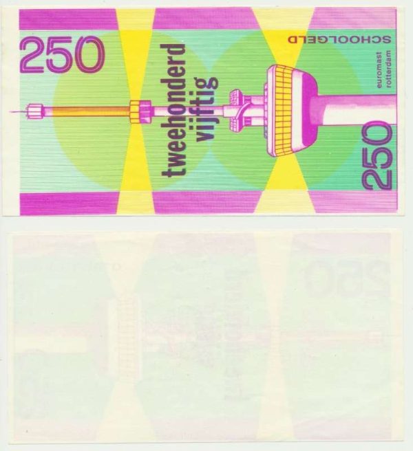 荷兰 250 盾仿制学费 这种纸条大约在 20 世纪 70 年代和 80 年代初被学校使用。 这张纸币的背面没有印刷。