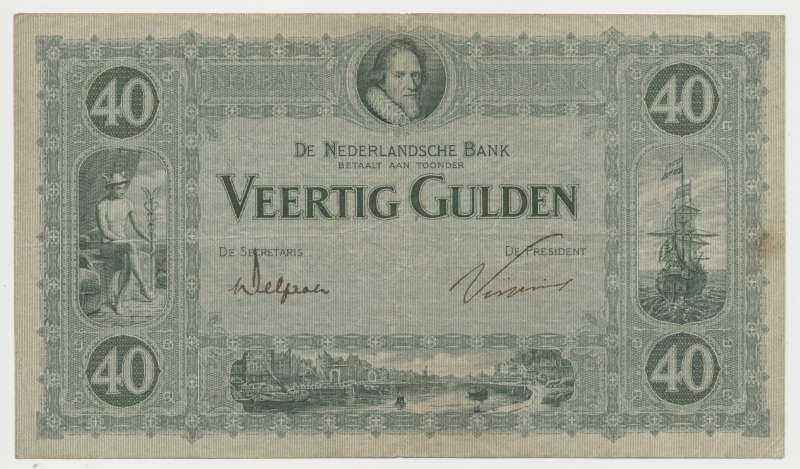 Het biljet van 40 gulden met prins Maurits is een bijzonder bankbiljet. De waarde van 40 gulden was dan ook niet gebruikelijk, maar er werden uiteindelijk door de Nederlandsche Bank drie biljetten van 40 gulden uitgegeven. De eerste in 1814, de tweede in 1861 en het laatste model werd in 1923 tot en met 1927 in omloop gebracht. Het 40 gulden biljet ‘Maurits’ heeft de handtekenen van DNB-President Vissering en DNB-Secretaris Delprat. Op de voorzijde is een galjoen te zien, Mercurius met staf en een rivier met een dorp. Op de achterzijde is een afbeelding van het oude gebouw van de Nederlandsche Bank aan de Turfmarkt in Amsterdam te zien. Het biljet is uiteindelijk in 1945 bij de geldzuivering uit omloop gehaald. Het biljet is niet veel in omloop geweest, omdat de waarde van 40 gulden niet erg gebruikelijk was in circulatie. Het is daarom vandaag de dag ook lastig om aan te komen.